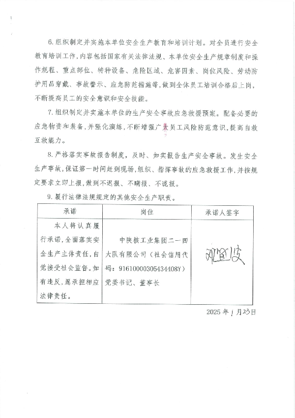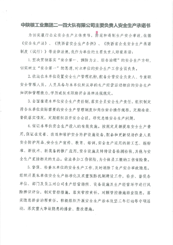 中陜核工業集團二一四大隊有限公司主要負責人安全生產承諾書