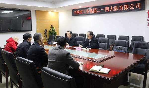 3月2上午中陜核集團公司黨委副書記馮凱帶領黨委工作部部長金衛平一行蒞臨二一四大隊有限公司調研指導工作公司領導及相關部門單位負責人參加會議。