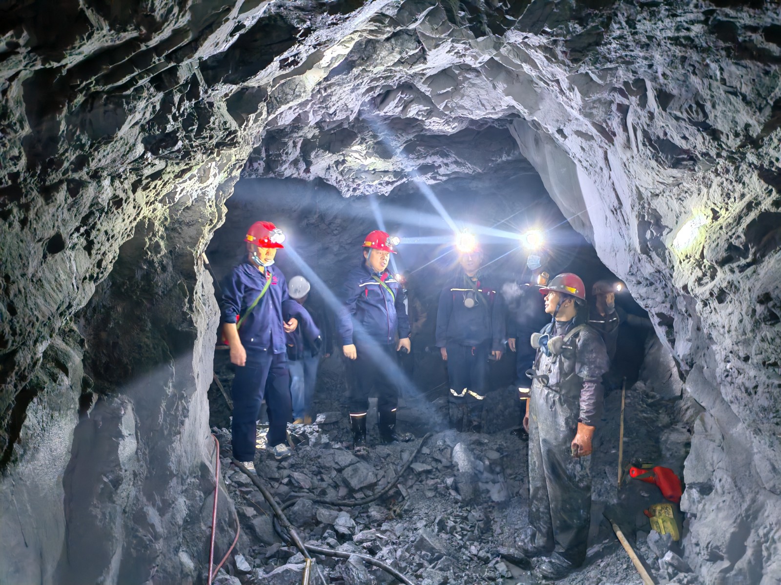 郭建軍一行到達(dá)項(xiàng)目硐探施工現(xiàn)場后,全面檢查了硐探工程現(xiàn)場實(shí)施情況,仔細(xì)聽取了項(xiàng)目組安全員對項(xiàng)目進(jìn)展和安全管理工作的詳細(xì)匯報(bào),隨后深入坑道平巷內(nèi)檢查現(xiàn)場施工情況。