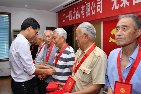 儀式現場氣氛莊重熱烈,鄧盛波代表公司黨委作“共榮在黨50年”致敬詞,向“光榮在黨50年”的老同志致以崇高的敬意和誠摯的問候,感謝他們在國家建設發展各個時期在不同崗位上為黨的事業做出的重要貢獻。為黨齡達到50年的黨員代表頒發“光榮在黨50年”紀念章,是中國共產黨成立100周年慶祝活動的重要組成部分。這既體現了黨中央和習近平總書記對老黨員、老同志的關心厚愛,也體現了老同志多年來對國家建設和二一四發展做出巨大貢獻的充分肯定。