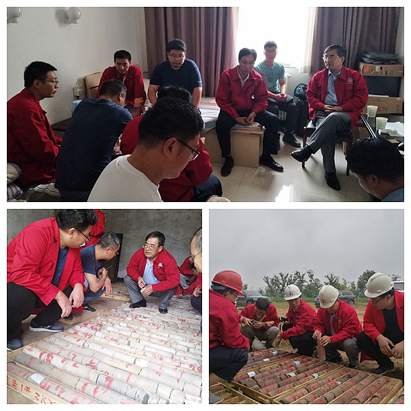 李靠社一行到達項目部后,首先到巖心庫仔細查看了鉆孔巖心,檢查了編錄質量,并和項目技術人員進行了詳細交流與探討。隨后冒雨深入鉆機施工現場檢查了鉆探施工安全、質量、進度等情況,對現場巖心進行觀察,并對項目進行了全面指導,傳授了豐富的找礦經驗。李靠社對項目前期工作給予了充分的肯定,項目第一個鉆孔取得開門紅見工業孔,這對公司與中石化后期合作打下基礎,并為項目找礦成果樹立了信心,同時對項目下步工作部署提出了指導性意見,并提倡綠色勘查,要求項目在實施過程中加強環保工作,加強綜合研究,努力提高業務水平,并祝愿項目在杭錦旗區塊取得更好的成果。