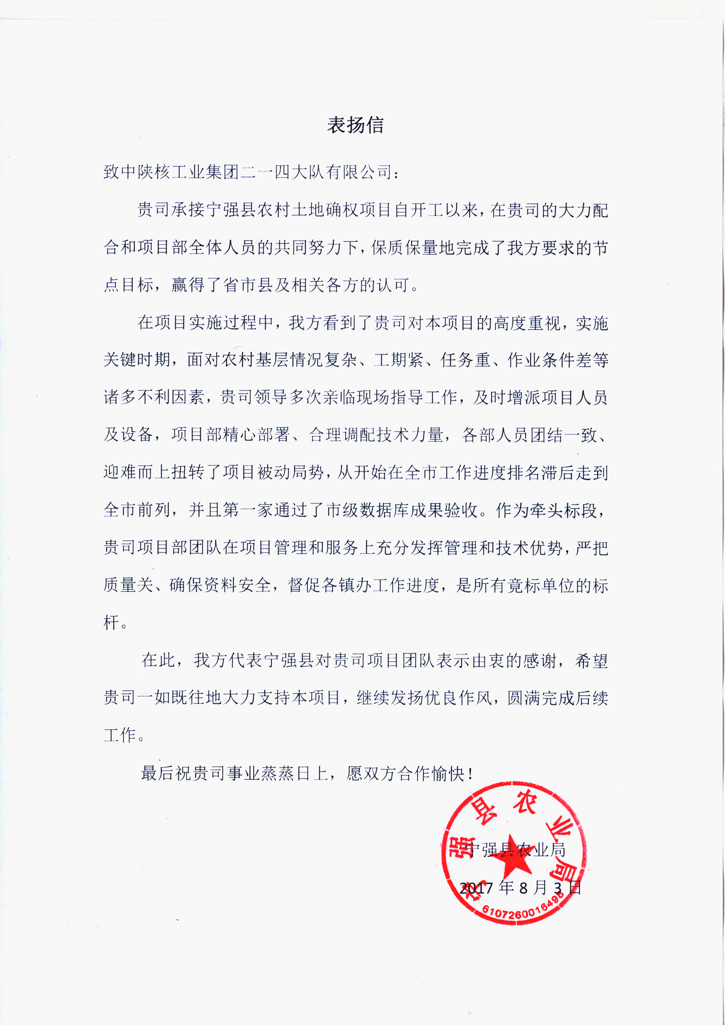 8月3日,公司收到寧強縣農(nóng)業(yè)局的表揚信,稱贊公司領導多次親臨現(xiàn)場指導,精心部署,增派技術(shù)人員。項目部人員團結(jié)一致、迎難而上扭轉(zhuǎn)了項目被動局面,使寧強縣土地確權(quán)工作進度從漢中市排名滯后走到全市前列,成為第一家通過了市級數(shù)據(jù)成果驗收,是所有競標單位的標桿。