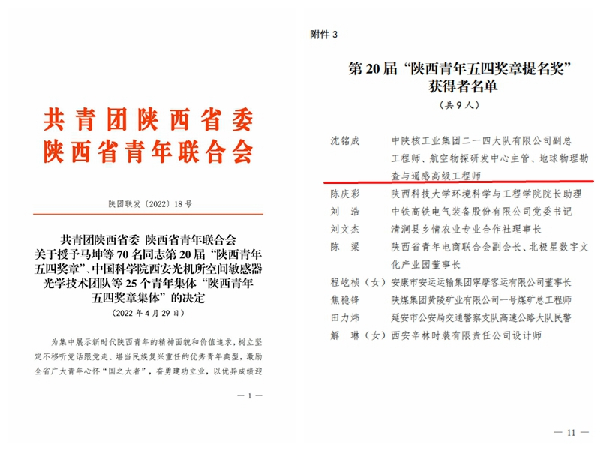 喜報!公司沈銘成榮獲第20屆“陜西青年五四獎章提名獎”